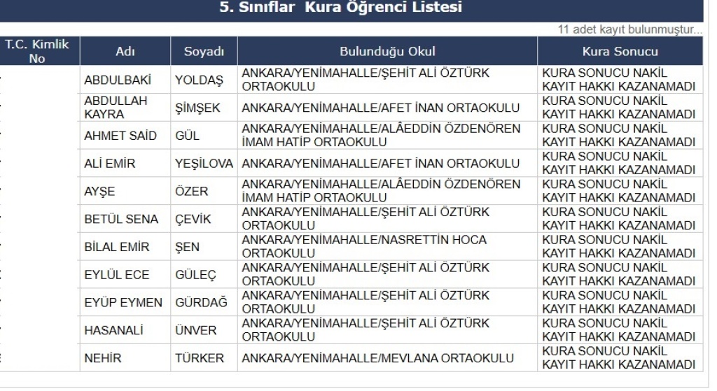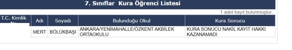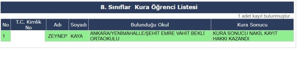 2025-2026 Öğretim Yılı Kura Sonucu Nakil Hakkı Kazanan Öğrenci Listesi