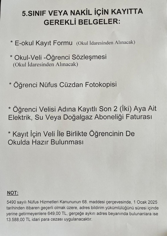 5490 sayılı Nüfus Hizmetleri Kanununun 68. maddesi çerçevesinde, 1 Ocak 2025 tarihinden itibaren geçerli olmak üzere, adres bildirim yükümlülüğünü süresi içinde yerine getirmeyenlere 649,00 TL, gerçeğe aykırı adres beyanında bulunanlara ise 13.588,00 TL idari para cezası uygulanacaktır. Kamuoyunun bunu göz önünde bulundurması rica olunur.